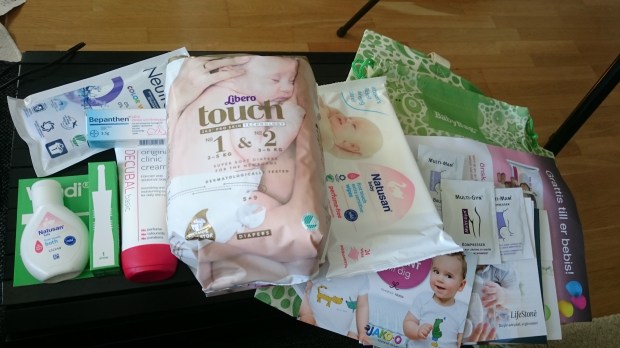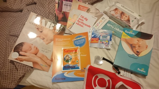 Uppdatering 2018: Bilden ovanför är en babybox från Babyproffsen, denna är från 2018. Här fick jag en haklapp, nappflaska, våtservetter, plastsked, Purelan, prova på erbjudande på viaplay, trosskydd, blöjor från Pampers och erbjudande med rabatter.