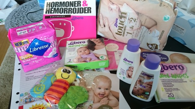 Liberos babybox innehöll år 2016 det som man ser på ovan bild. Jag blev glad över att få ett helt paket med blöjor, vilket brukar var lite snålt med i de andra boxarna. Oljan har gått åt och våtservetterna samt den lilla leksaken har använts när min lilla dotter kom till världen. Man hämtar ut boxen på ICA Maxi som brukar skicka med egna erbjudanden i affären.