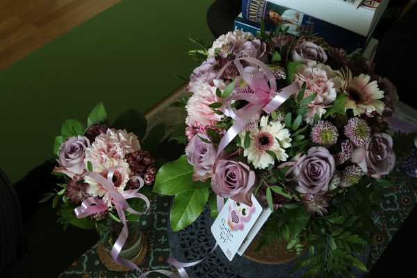 Mamma/barn blombuketter består av en stor och en liten bukett som är länkade ihop via ett band.