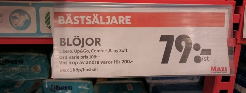 Det var ingen som sa till mig att om man köper för en viss summa exempelvis över 200 kr på ICA Maxi så får man köpa Libero blöjor för 79 kr istället för 108 kr. Jag märkte det av en slump när jag skulle handla på ICA Maxi när jag kollade på kvittot. Jag trodde … Fortsätt läsa Köp över 200 kr och få billigare blöjor